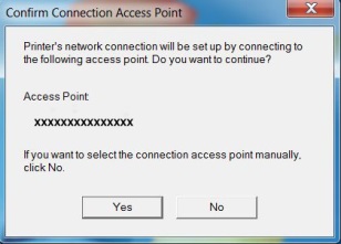 2. Une fois votre imprimante détectée, l'écran suivant s'affiche. Le nom du point d'accès auquel votre ordinateur est connecté s'affiche (là où « xxxxxxxxxxxxx » apparaît). S'il s'agit du réseau sans fil auquel vous souhaitez connecter votre imprimante, cliquez sur [Oui].